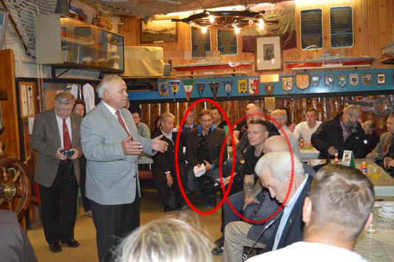 Kameradschaftsabend bei der Marinekameradschaft Klagenfurt: Hermann Kandussi spricht, dahinter Herr Fister. Im linken Kreis der kärntner Historiker Florian Rulitz, gleich daneben, im rechten Kringel, der Leipziger Neonazi Nils Larisch.