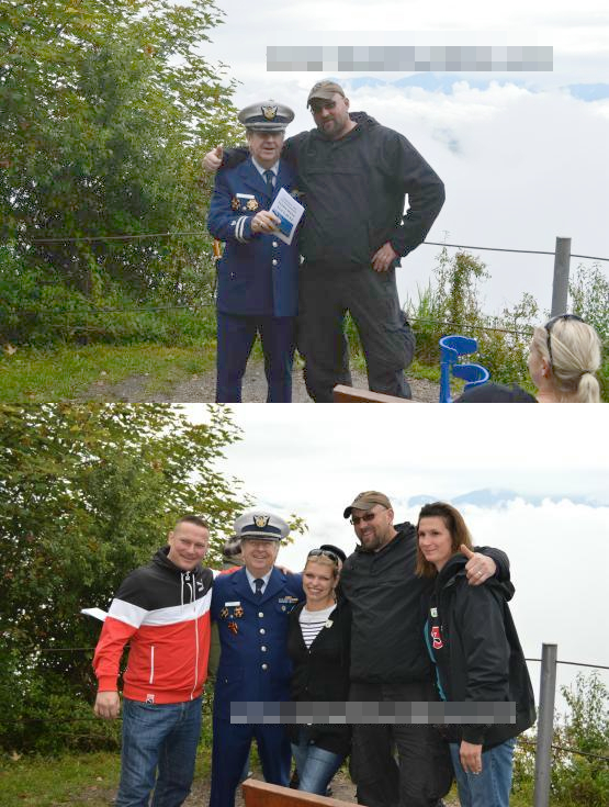 Zwei Fotos vom allgemeinen Fotoschießen am Gipfel des Ulrichsbergs. Oberes Fotos, rechts: Neonazi-Kader Riccardo Sturm, links: Harry Cooper, US-Küstenwache. Unteres Fotos, von links: Neonazi-Kader Nils Larisch, Harry Cooper, Connie (zusammen mit Nils Larisch), Neonazi Riccardo Sturm. Die namentlich unbekannte Frau ganz rechts trägt einen "Jubeljahr 1933"-Pullover aus dem Neonazi-Versandhandel "Hermannsland" - der Nils gehört.